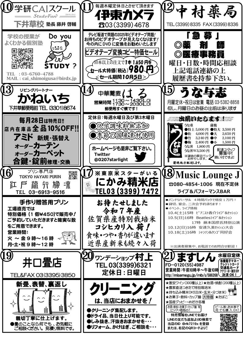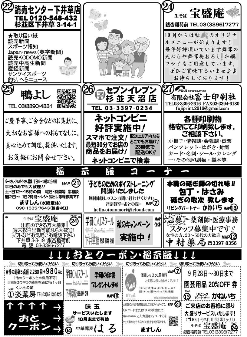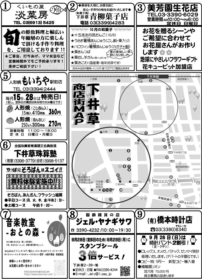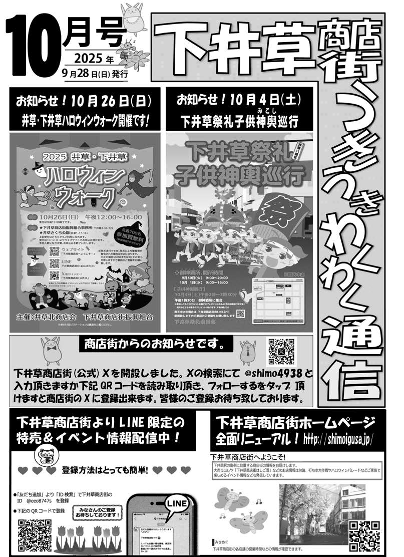 毎月、新聞の折り込みでお届けしている「下井草商店街うきうきわくわく通信」(B4、4ページ)を、この度ホームページでも公開することになりました!この通信には、お店ごとのイチオシ情報や、季節のイベント情報、お得情報など、商店街の「今」と「魅力」がギュッと詰まっています。商店街を訪れる前に、また、お買い物の合間に、ぜひ「うきわく通信」をチェックして、新しい発見やお得な情報を見つけてください。