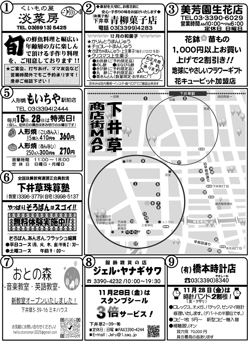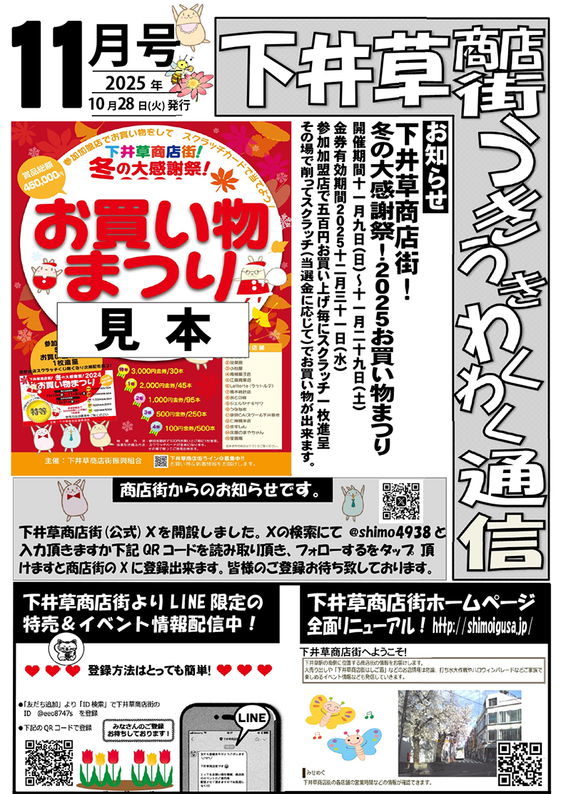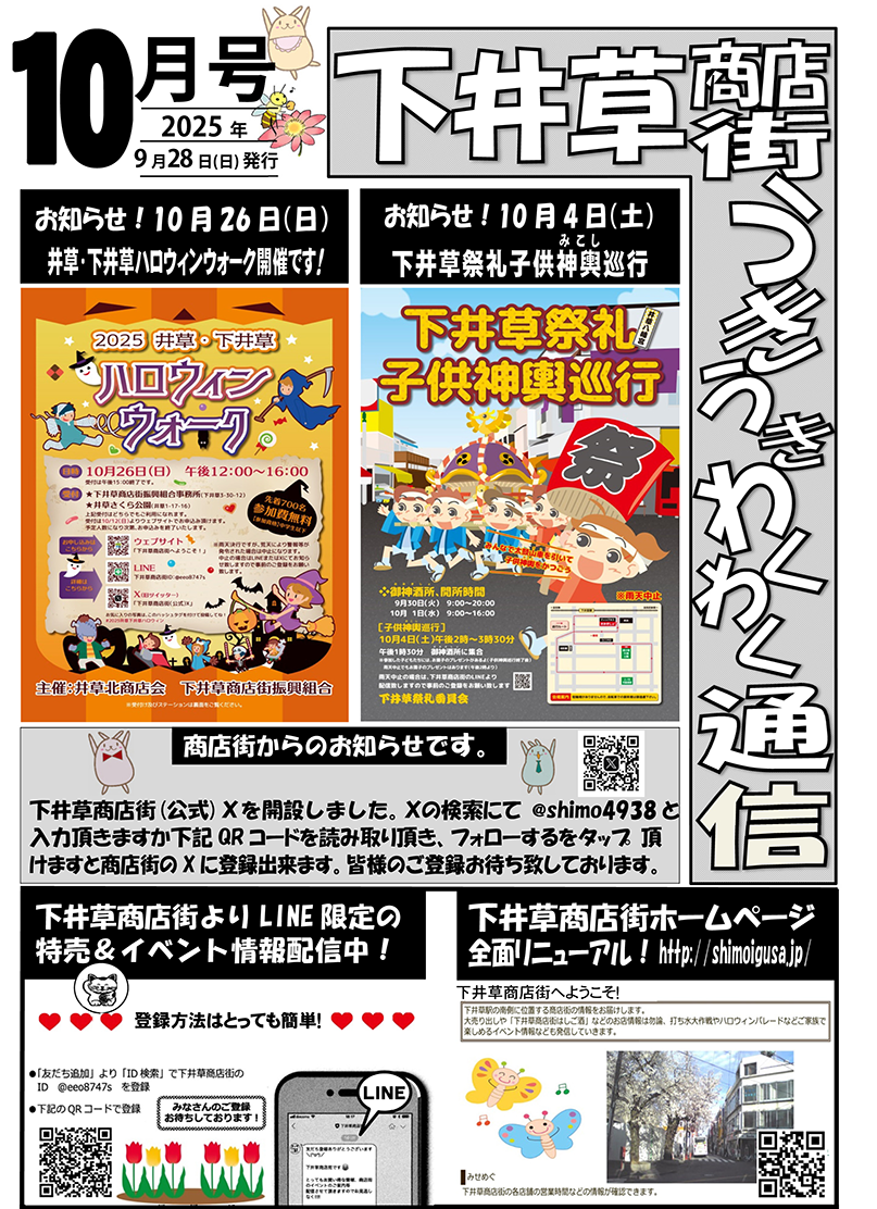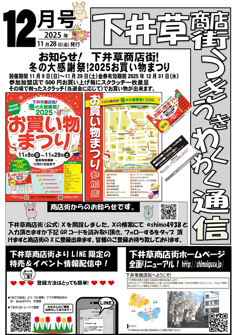毎月、新聞の折り込みでお届けしている「下井草商店街うきうきわくわく通信」(4ページ)を、この度ホームページでも公開することになりました!この通信には、お店ごとのイチオシ情報や、季節のイベント情報、お得情報など、商店街の「今」と「魅力」がギュッと詰まっています。商店街を訪れる前に、また、お買い物の合間に、ぜひ「うきわく通信」をチェックして、新しい発見やお得な情報を見つけてください。