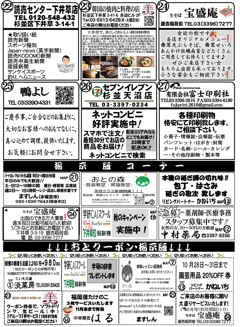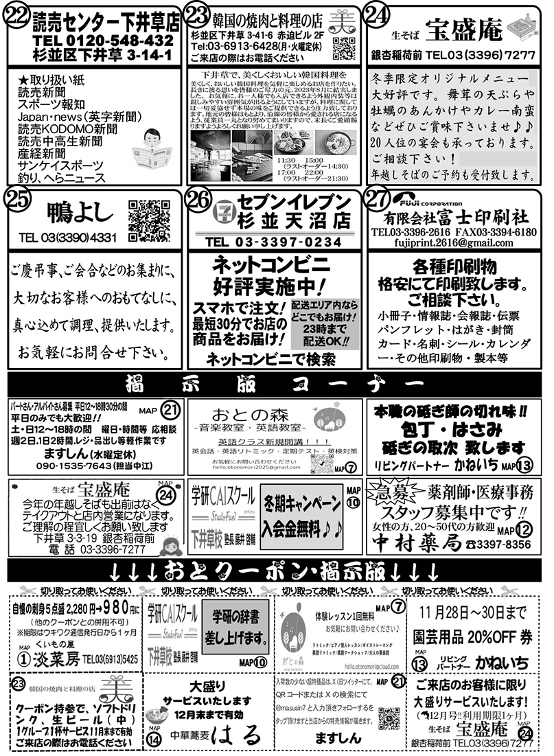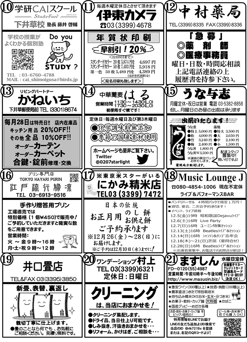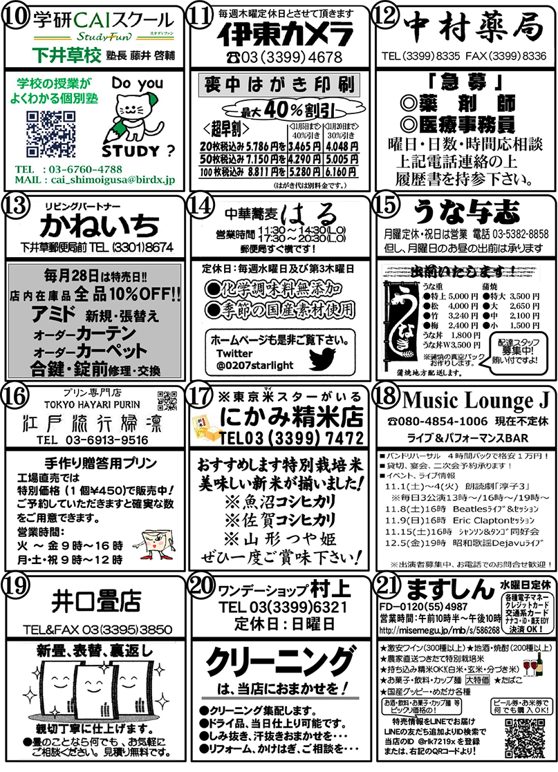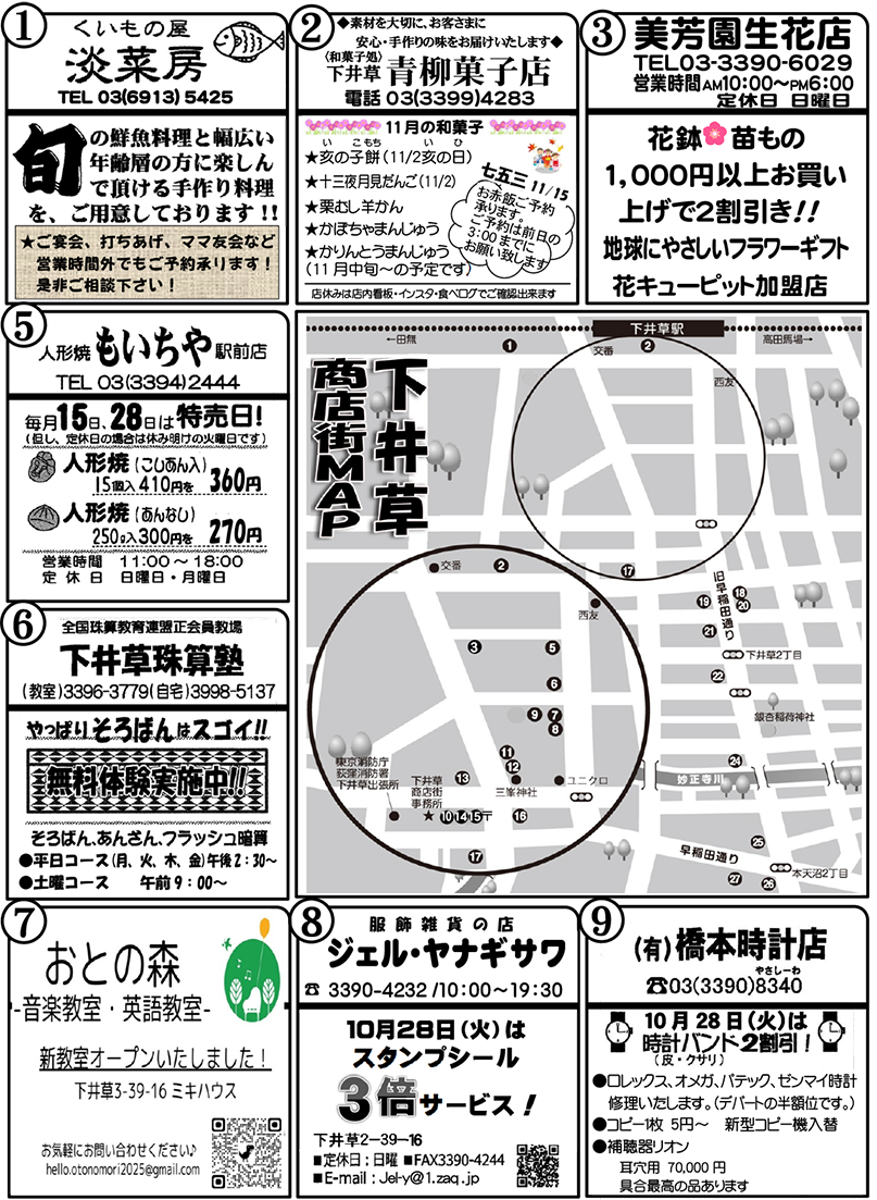 毎月、新聞の折り込みでお届けしている「下井草商店街うきうきわくわく通信」(4ページ)を、この度ホームページでも公開することになりました!この通信には、お店ごとのイチオシ情報や、季節のイベント情報、お得情報など、商店街の「今」と「魅力」がギュッと詰まっています。商店街を訪れる前に、また、お買い物の合間に、ぜひ「うきわく通信」をチェックして、新しい発見やお得な情報を見つけてください。